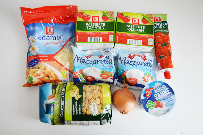 Zuerst kocht ihr die Nudeln ganz normal nach Packungsanleitung und in der Zwischenzeit könnt ihr auch schon die Zwiebel klein schneiden. Danach bratet ihr die Zwiebel an, gebt dann die passierten Tomaten, die Sahne und das Tomatenmark hinzu und würzt alles nach Belieben (ich habe Pfeffer, Salz und Oregano verwendet). Wenn die Nudeln fertig sind und die Soße aufgekocht hat, dann gebt ihr beides abwechselnd in eine Schüssel und verteilt den Mozzarella und den Edamer zwischen den Schichten und natürlich auch oben drauf. Das Ganze gebt ihr dann auf 180°C für ca. 25 Minuten in den Ofen, bis der Käse leicht goldbraun wird.