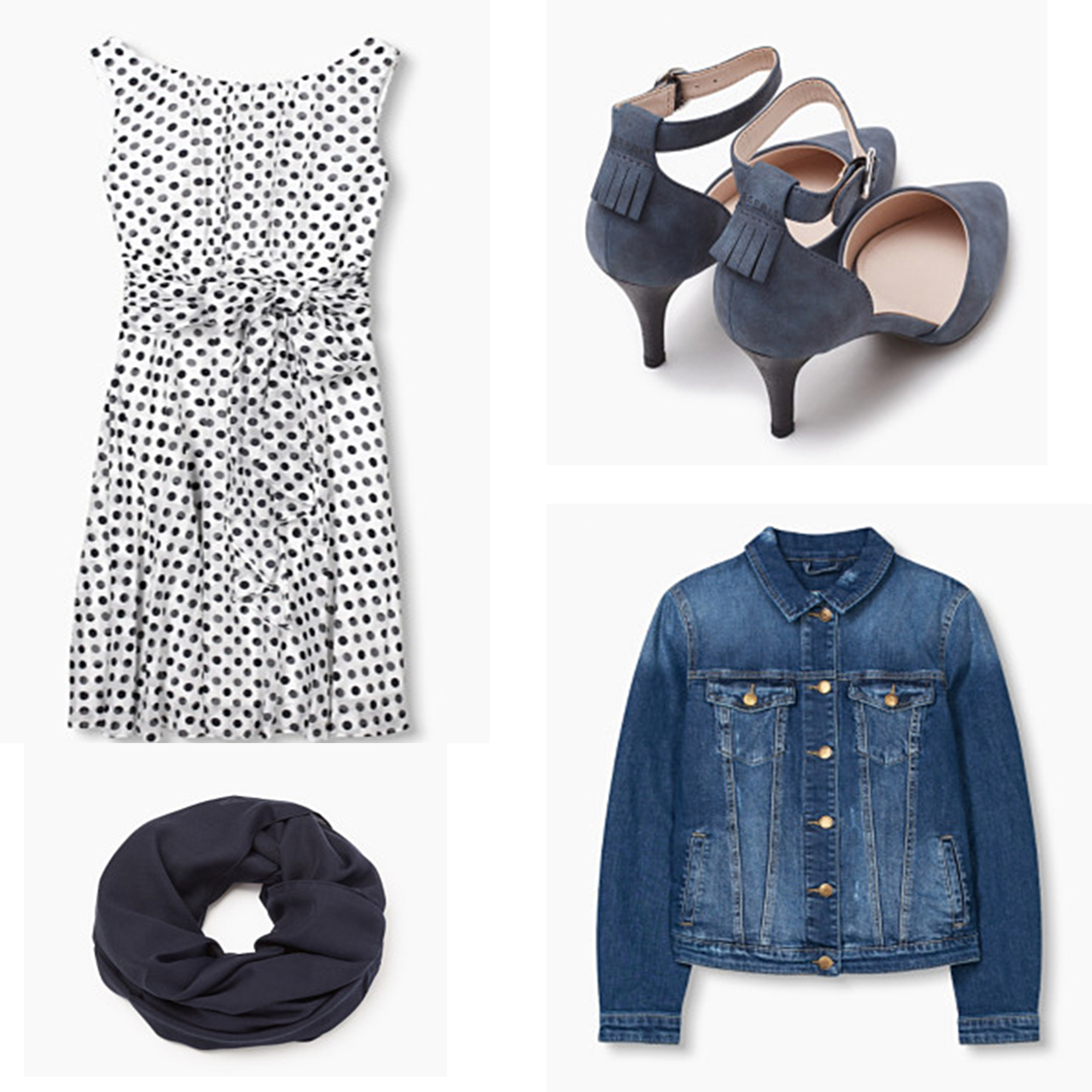 Das erste Outfit besteht aus einem gepunkteten Kleid, einer Jeansjacke und Pumps. Da es im Frühling aber abends doch noch recht kühl werden kann, würde ich auf jeden Fall noch einen Schal dazu tragen. Die Kombination aus Kleid und Pumps ist ja eigentlich eher schicker, aber meiner Meinung nach lässt die Jeansjacke das Ganze ein wenig lockerer wirken.