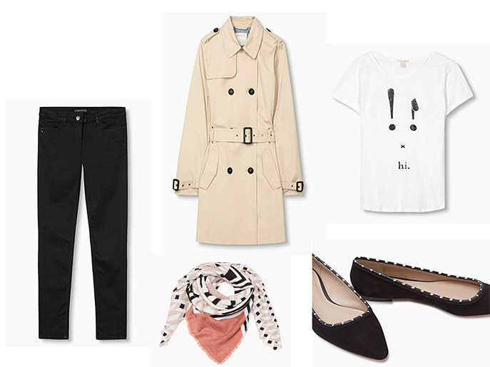 Beim dritten Outfit steht definitiv der Trenchcoat im Vordergrund. Deshalb würde ich dazu nur eine schlichte schwarze Jeans und ein Tshirt kombinieren. Für abends würde ich noch ein gemustertes Tuch dazu tragen und schwarze Ballerinas gehen doch sowieso immer.