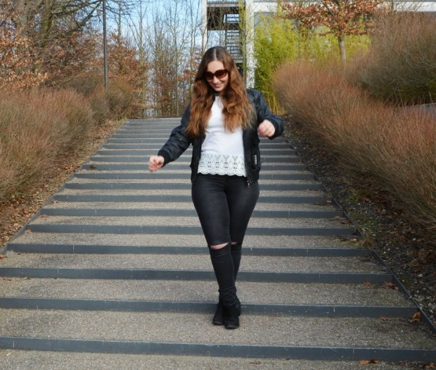 Deine Jacke mag ich ja ziemlich gern, muss ich zugeben. Dafür ist das restliche Outfit nicht ganz mein Fall – Schlitze an den Knien mag ich nicht und weiße Oberteile meide ich immer 😉