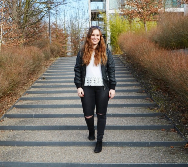Deine Jacke mag ich ja ziemlich gern, muss ich zugeben. Dafür ist das restliche Outfit nicht ganz mein Fall – Schlitze an den Knien mag ich nicht und weiße Oberteile meide ich immer 😉