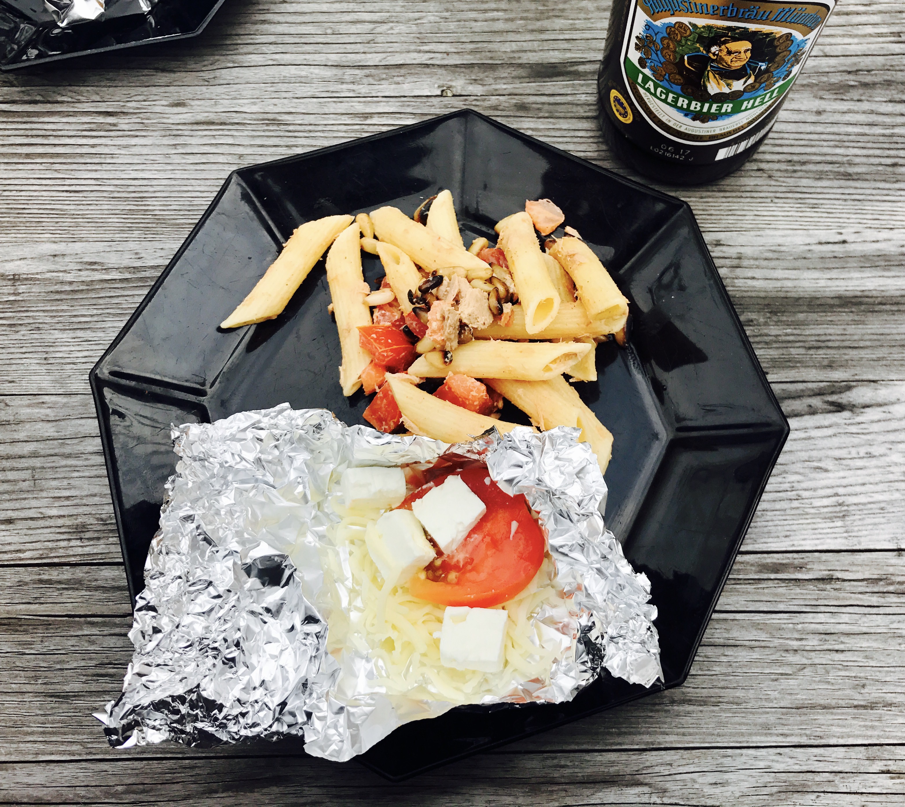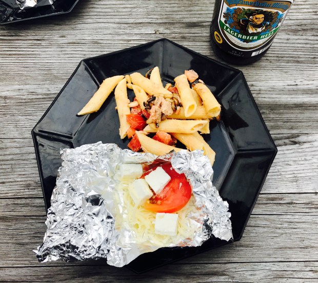 Mittwoch Abend habe ich mit Freunden gegrillt und da ich keine Lust hatte, Fleisch zu essen, habe ich mir einfach Tomaten, Feta und Mozzarella gegrillt. Dazu gab es natürlich noch Nudelsalat und Kräuterbaguette.
