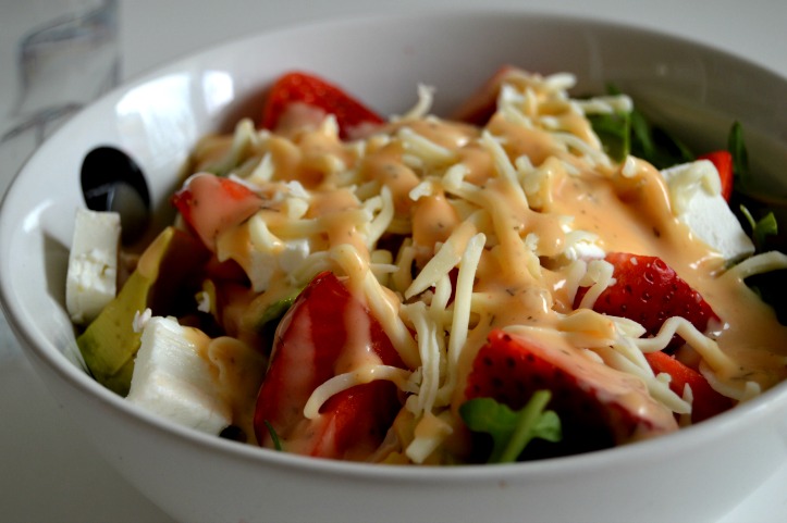 Freitag habe ich eine ziemlich große Portion Salat mit Avocado, Erdbeeren und Käse gegessen – ich liebe diese Kombination einfach.