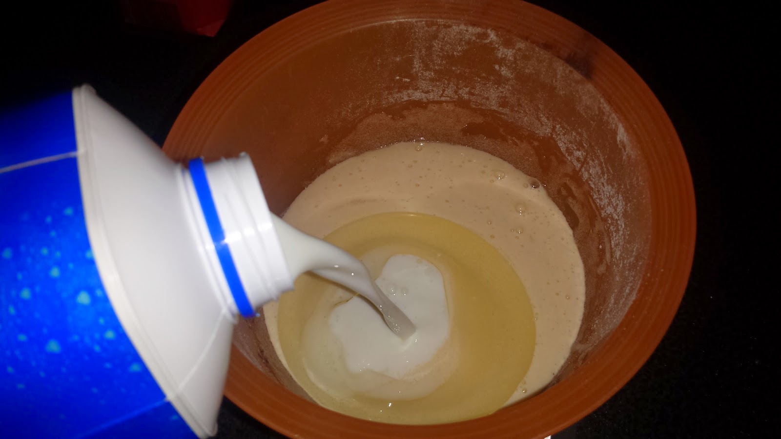In einer weiteren Schüssel quirlt ihr das Ei auf und gebt den Zucker, das Öl und die Milch hinzu und vermischt es gut.