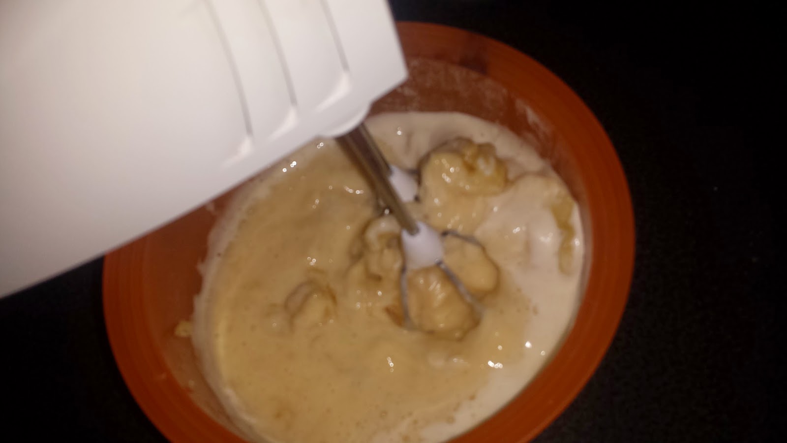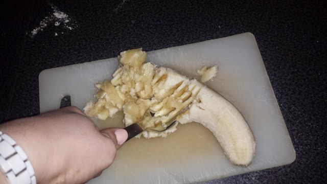 Dann zerdrückt ihr die geschälten Bananen – reifere Bananen eignen sich wesentlich besser als frische, da diese weicher sind – mit einer Gabel und vermischt diese mit der flüssigen Masse.